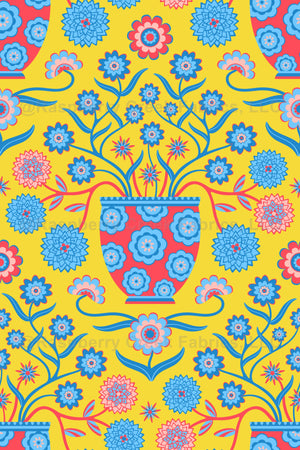 Icy Blue, Red and Subtle Pink bouquets in decorative vases! A modern and fun take on classic damask floral patterns on a Sunshine Yellow background!