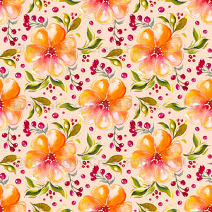 Large orange blooms with green leaves and deep magenta red berry botanicals on peach. Boho watercolor floral.Medium Scale, fabric, home decor, Spring, Summer