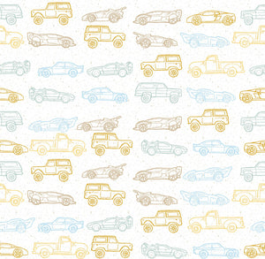 Khaki Light Blue and Orange Line Drawn Car Print Fabric, Mom Wheels by Bri Powell