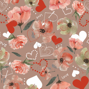Scattered hearts in solid and dotted red and solid white, double-lined white, and dotted white surrounded by watercolor flowers and the hand lettered text "love" . Valentines Day was never more Kitchy. Random white dots on a beige-pink background. Holiday, Love, Valentine. Toss, lettered text can be read in any direction.
