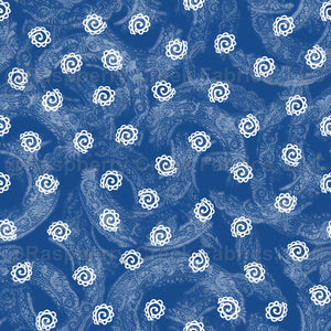 Lacey curlicues in white over dark cornflower blue with a lace texture. At default 150 dpi scale, curlicues are appx. 3/4 inch in size. Paisley Flowers Collection