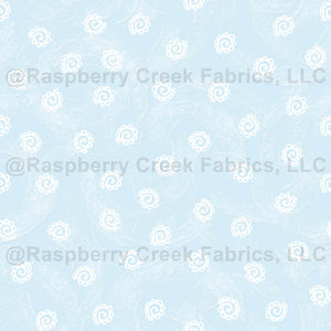 Lacey curlicues in white over pale pale blue with a lace texture. At default 150 dpi scale, curlicues are appx. 3/4 inch in size. Paisley Flowers Collection