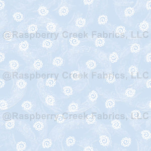 Lacey curlicues in white over pale blue with a lace texture. At default 150 dpi scale, curlicues are appx. 3/4 inch in size. Paisley Flowers Collection