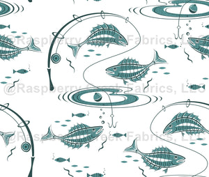 My original vector illustrations of vintage 1950s inspired fish, fishing poles and water, in cadet blue, and slate on a white background. ©Christine Duffield 2020