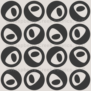 Large carbon grey eyed dots tasselating stripes art deco style. Understated elegance with ornamental charm. The muted, elegant color palette lends a timeless and refined appearance. For modern interiors, textiles and wallpapers.