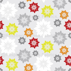 Large, flower-like mandalas in a bold winter color palette of white, shades of gray, red, orange, and neon yellow on a snowy white background.