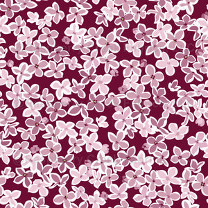 Large pink lilac blossoms all over tossed floral spring burgundy red. Welcome spring to your home. When you see these lilac blossoms and flowers imagine the intoxicating scent evoking feelings of nostalgia and serenity.