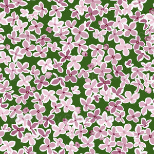 Large pink lilac blossoms all over tossed floral spring green. Welcome spring to your home. When you see these lilac blossoms and flowers imagine the intoxicating scent evoking feelings of nostalgia and serenity.