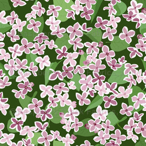 Large pink red lilac blossoms all over with leafs tossed spring green. Welcome spring to your home. When you see these lilac blossoms and flowers imagine the intoxicating scent evoking feelings of nostalgia and serenity.