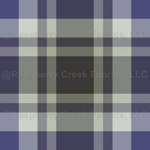 This plaid design features large mirrored stripes in shades of American blue, charcoal, and pewter gray.