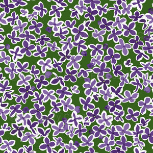 Large purple lilac blossoms all over tossed floral spring green. Welcome spring to your home. When you see these lilac blossoms and flowers imagine the intoxicating scent evoking feelings of nostalgia and serenity.