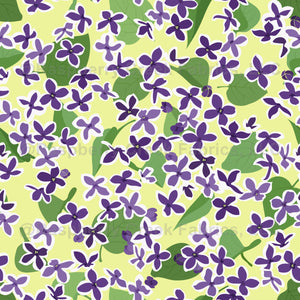 Large purple lilac blossoms all over with leafs tossed spring green yellow. Welcome spring to your home. When you see these lilac blossoms and flowers imagine the intoxicating scent evoking feelings of nostalgia and serenity.