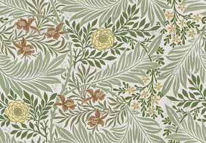 An arts and crafts design from the mid 1870's created by William Morris of fern-like foliage interspersed with smaller flowers and leaves. NOT an AI generated image. A sympathetic restoration of an original antique wallpaper sample in one of the original Victorian colorways. See the SalvageScapes LARKSPUR collection for a wide range of colorways in both pure and multi color versions.