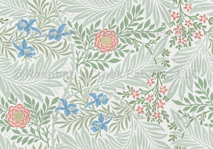An arts and crafts design from the mid 1870's created by William Morris of fern-like foliage interspersed with smaller flowers and leaves. NOT an AI generated image. A sympathetic restoration of an original antique wallpaper sample in one of the original Victorian colorways. See the SalvageScapes LARKSPUR collection for a wide range of colorways in both pure and multi color versions.