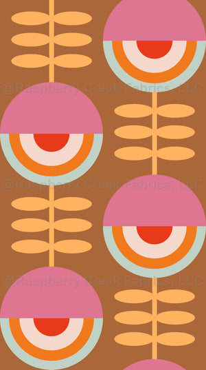 Colorful geometrical flowers on moderate tangelo background, retro 70s style.