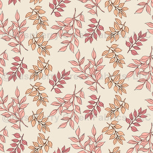 Leaf branches in peach, orange, and pink on a light beige/peach background.
