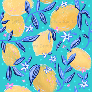 Lemons, kitchen, hand drawn, turquoise, navy blue, blue, yellow, kitchen, girls, women, Italian, fruit, summer , painterly