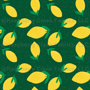 Bright yellow lemons tossed on a green polka dot background.
