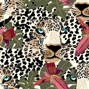 Leopard hiding in the tropical forest with bold flowers and palm leaves part of the Tropical friends collection.