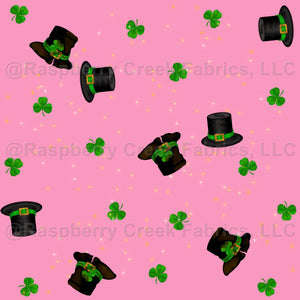 Spiffy new and battered old leprechaun hats create a fun ditsy design with some clover leaves on pink.