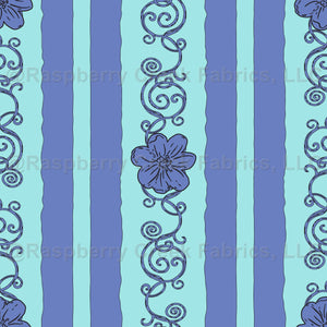 Black outlined Glaucous Blue stripes, scrolls, and florals on a solid Blue background, coordinate of the "Free Spirited Lilith's Trailing Florals Collection".