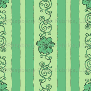 Black outlined Iguana Green stripes, scrolls, and florals on a solid Green background, coordinate of the "Free Spirited Lilith's Trailing Florals Collection".