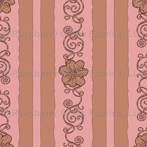 Black outlined Light Taupe Orange stripes, scrolls, and florals on a solid Pink background, coordinate of the "Free Spirited Lilith's Trailing Florals Collection".