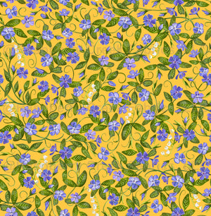 Lovely floral pattern of hand-painted Lily of the Valley and trailing Periwinkle vine on a yellow field. Great for traditional or contemporary home decor or apparel.