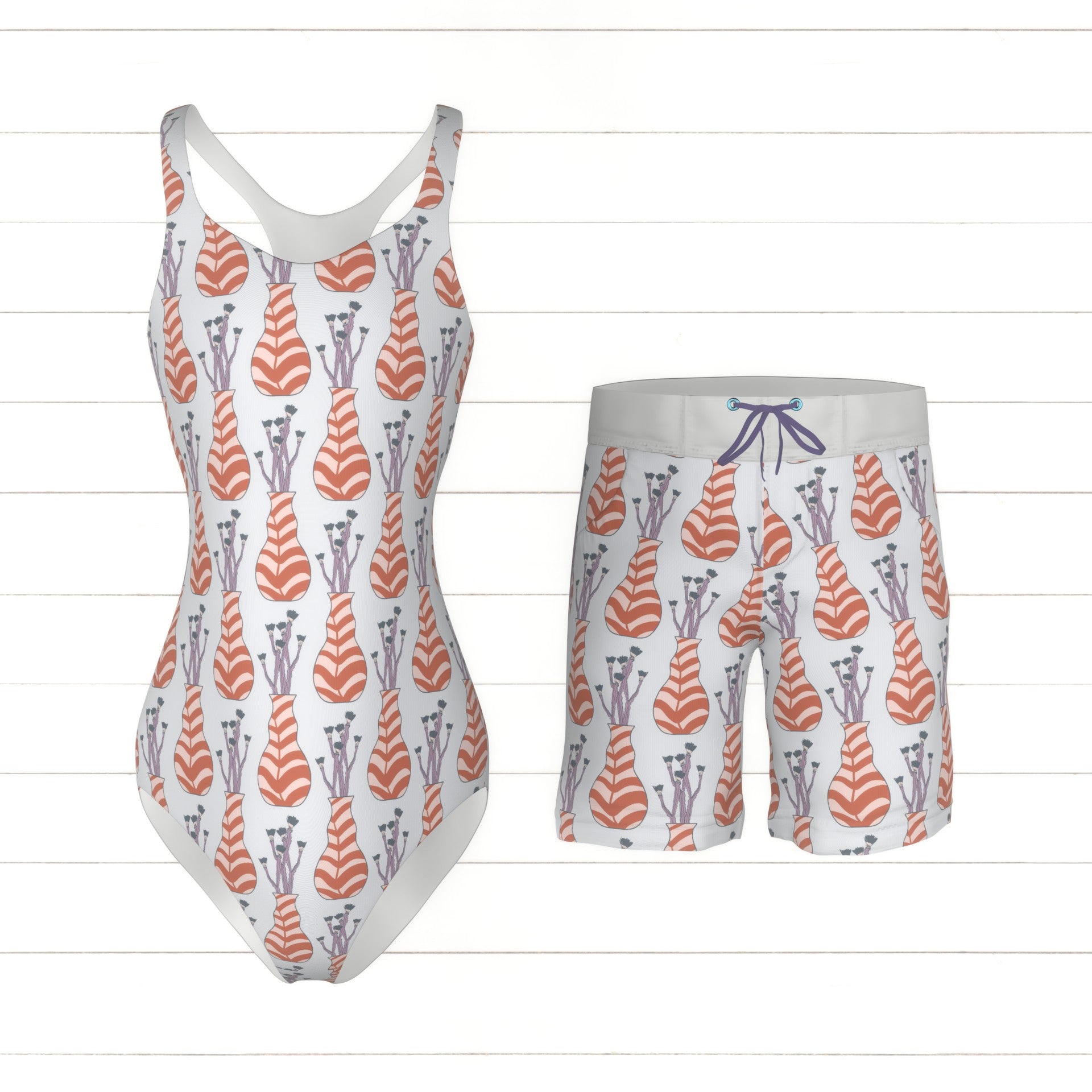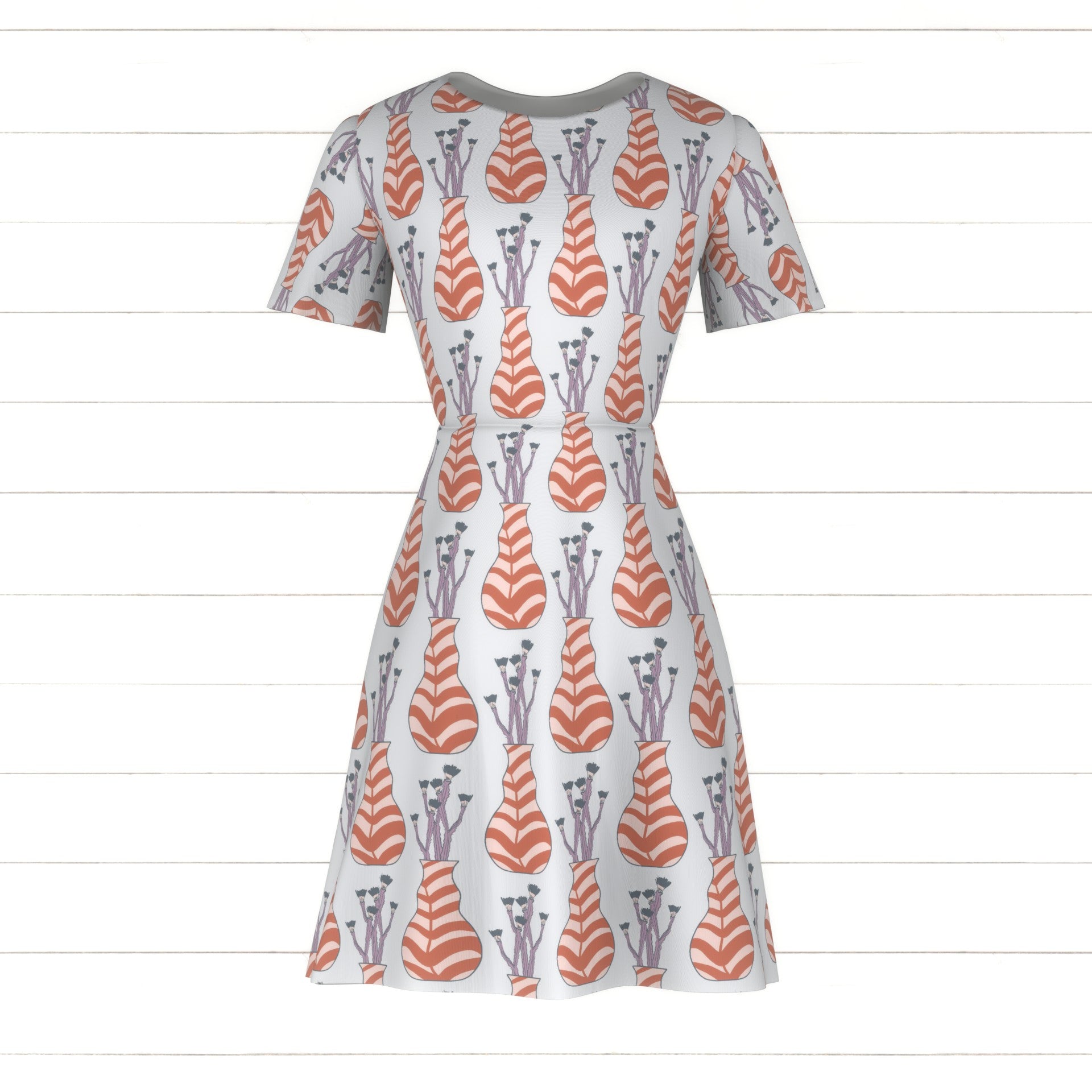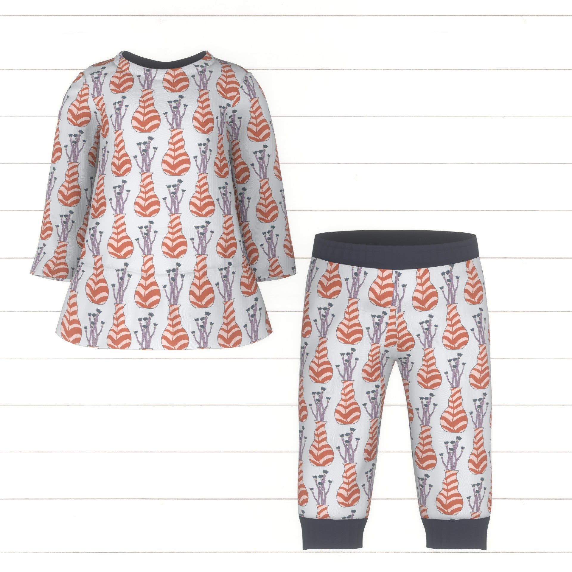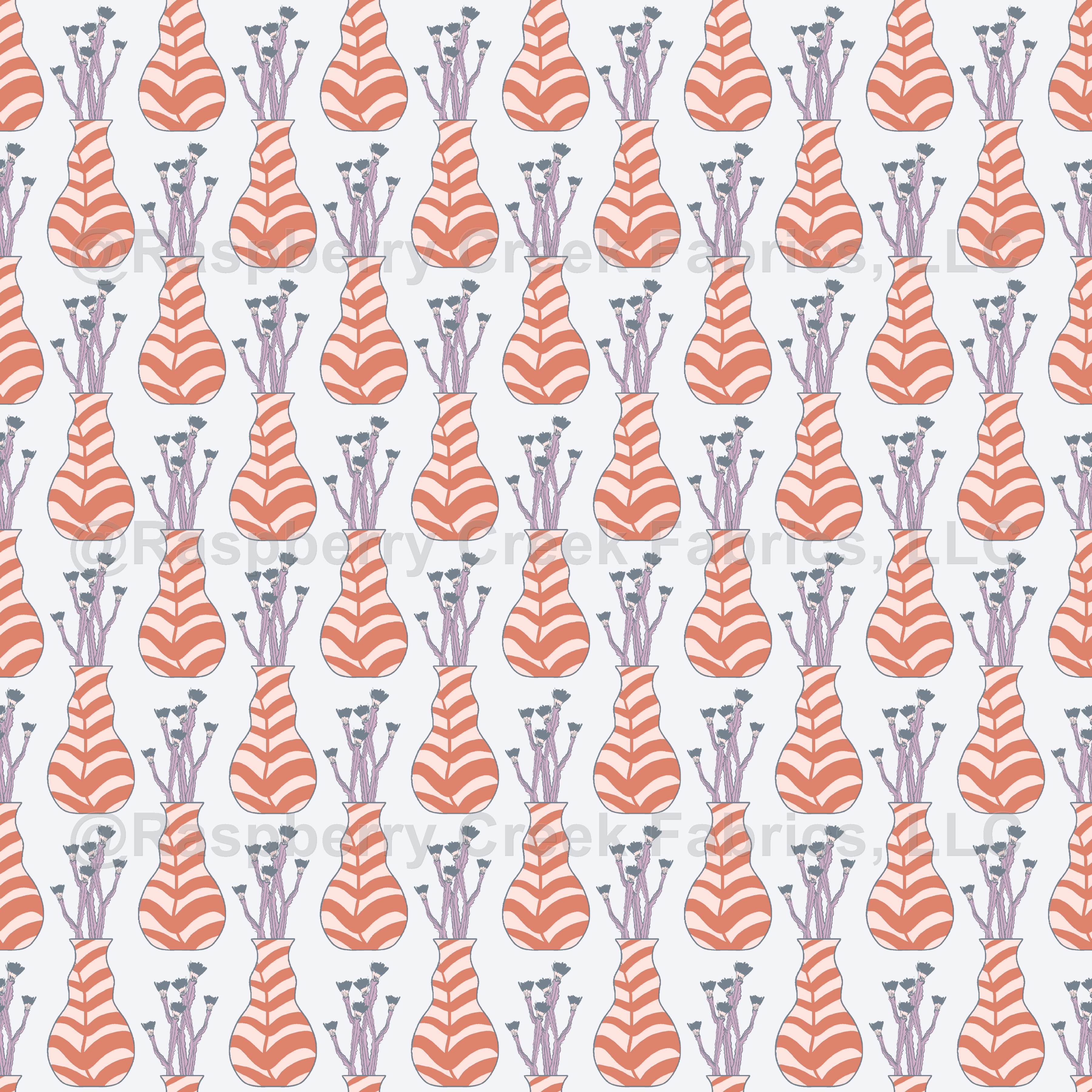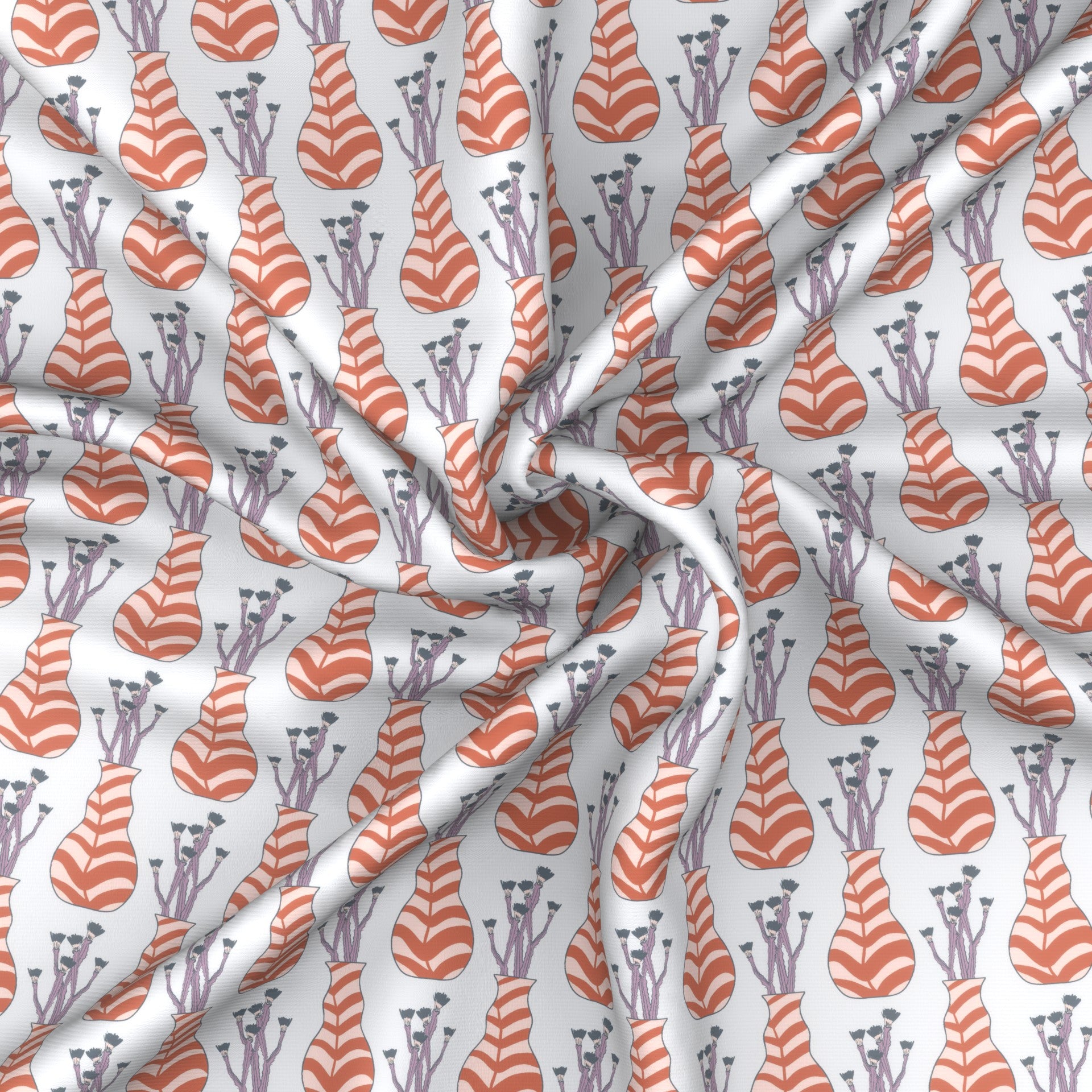 Hand drawn limonium flowers in a orange vase on a light blue background.