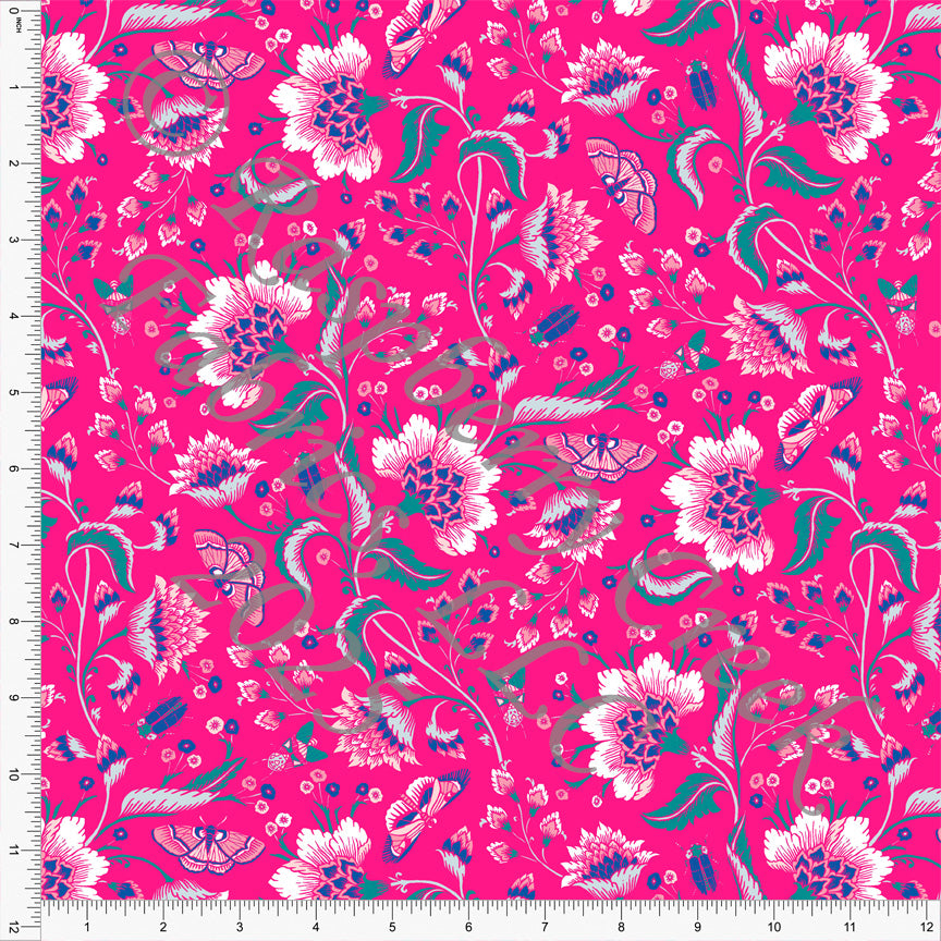 Lipstick Pink Royal Blue Peacock Teal and White Block Print Paisley Floral Print Fabric, Happy for CLUB Fabrics