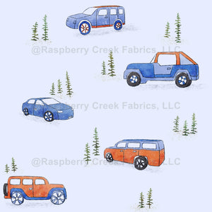 A playful baby boy car and truck pattern in fresh blue and orange tones, perfect for baby boy clothing and nursery decor.