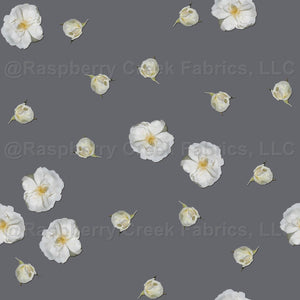 Scattered little white roses and rosebuds from Darlow's Enigma create a beautiful fabric design on Quiet Shade (medium grey).
