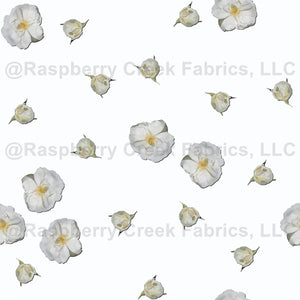 Scattered little white roses and rosebuds from Darlow's Enigma create a beautiful fabric design on white.