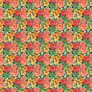 Hand-painted red watercolor roses and wildflowers on a dark blue background.