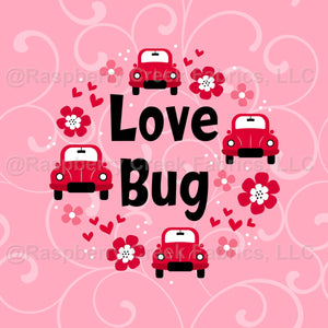 Love Bug Little Red Valentine Cars Hearts and Flowers Panel on Pink