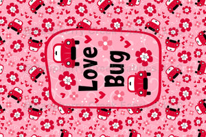 Love Bug Little Red Valentine Cars Hearts and Flowers Panel on Pink