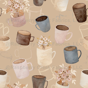 This arrangement of coffee mugs and floral bouquets was painted with watercolor and coffee on a caramel tan background, and is sure to bring a smile to every coffee-lover's face.