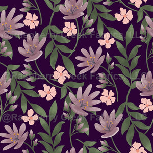 Lush garden purple flowers and peach pink wildflowers with lots of leaf branches and flower buds on a dark moody purple background