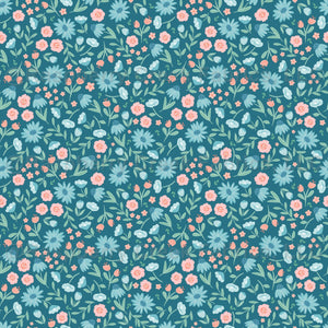 Part of my Lydia Collection | A ditsy small scale floral with pink, blue and white flowers on a dark turquoise background