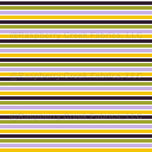 Coordinate for Madaleine Lavender Blooms Collection. Horizontal Stripes-Lavender, olive, deep violet, marigold, and white. Directional, blender, purple, home decor, fabric, interior design