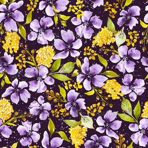 Lavender watercolor floral with green leaves, marigold yellow flowers and berry botanicals. Lavender splatter on deep violet background. Secondary Hero, Madeleine Lavender Blooms Collection. Fabric,wallpaper, home decor.