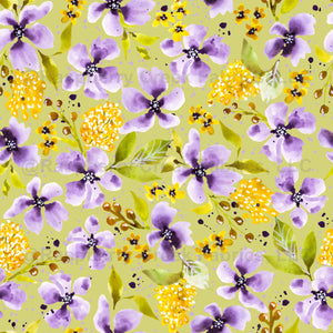 Lavender watercolor floral with green leaves, marigold yellow flowers and berry botanicals. Lavender splatter on avocado cream background. Fabric, home decor, purple