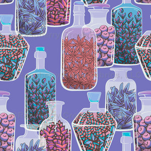 Features potion bottles full of herbs, spices, plants, and berries. Done in a purple, candy colored aesthetic.