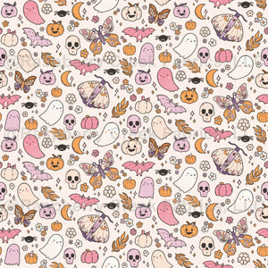 A fun, doodled Halloween design featuring all of the best spooky things in a retro pop color palette of pinks, purples, orange, and rust.
