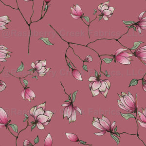 Pink and white magnolia blossoms on branches with green leaves in a scatter layout on a dusty pink background. Modern floral from an original watercolor and ink illustration. See the whole Magnolia Dreams Collection for designs for home decor, apparel, and accessories