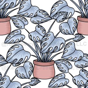 An original artwork drawn digitally by hand. This design shows off botanical aesthetics with a personally designed palette of soft blues and muted browns, set on a crisp white background. The classic monstera cheese plant in a whimsical majestic form.