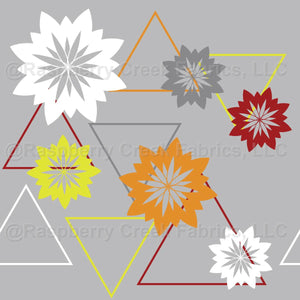 An abstract and geometric print featuring multi-colored mandalas and triangles in a bold winter palette of snow white, grays, red, orange, and neon yellow.