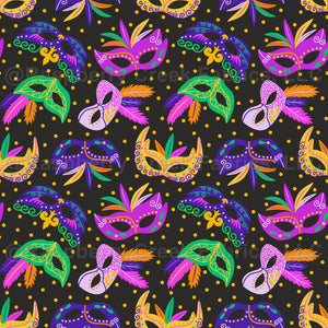 A pattern design featuring festive Mardi Gras carnevale masquerade masks in vibrant hues of green, pink, purple, violet, and yellow.