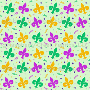 A pattern design featuring multicolor Mardi Gras fleur de lis icons with decorative confetti pieces.