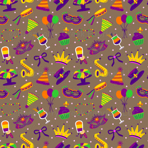 A Mardi Gras pattern featuring festive parade elements such as masquerade masks, fleur de lis, king cakes, balloons, cocktail drinks, jester hats, party hats, saxophones, tambourines and more.